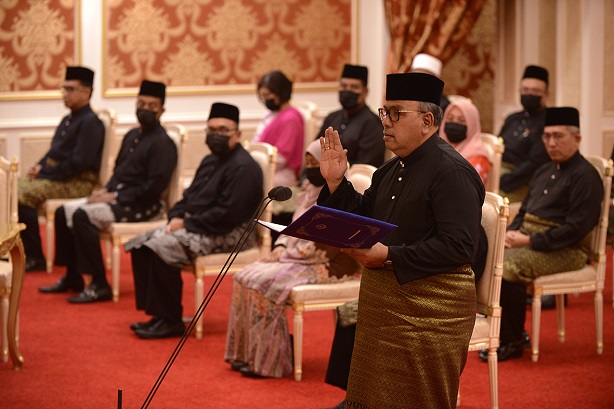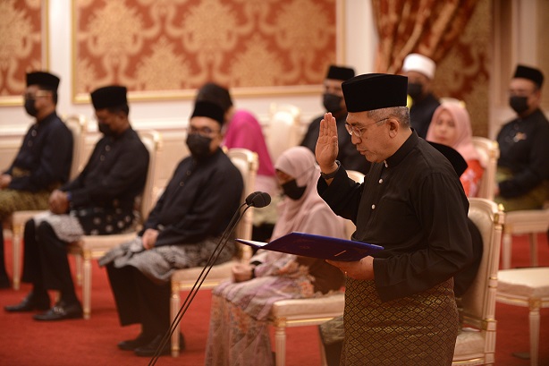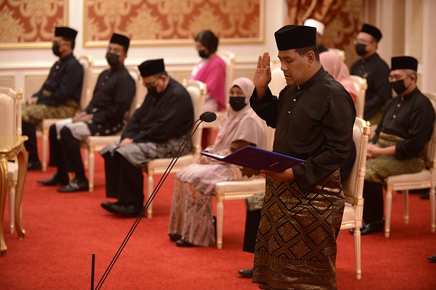 KUALA KANGSAR, 10 Disember- Lima Ahli Dewan Undangan Negeri (ADUN) Perak mengangkat sumpah jawatan sebagai Ahli Majlis Mesyuarat Kerajaan Negeri di hadapan DYMM Paduka Seri Sultan Perak, Sultan Nazrin Muizzuddin Shah di Istana Iskandariah hari ini.