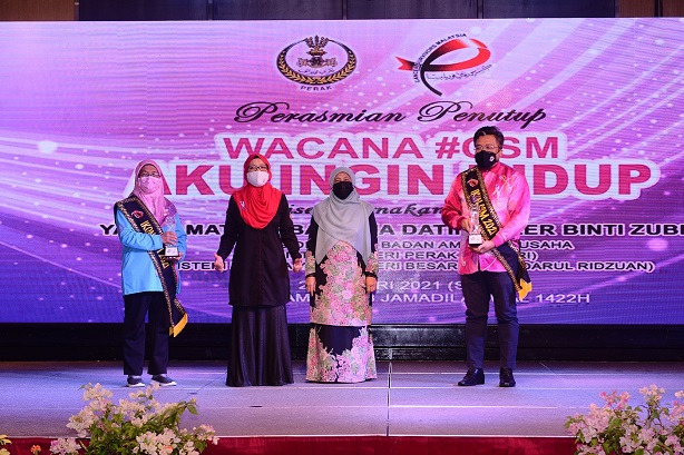 Yang Dipertua Badan Amal dan Usaha Isteri Negeri Perak (BAIDURI), YBhg. Datin Aezer binti Zubin bergambar bersama Pengerusi Cancer Survivor Malaysia (CSM), Puan Zuraini binti Kamal dan penerima Anugerah Ikon CSM.