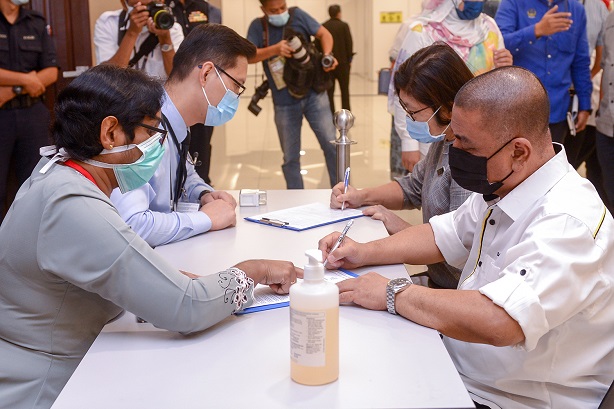YAB Dato’ Saarani bin Mohamad mengetuai seramai 221 individu menerima suntikan tersebut yang turut terdiri daripada barisan Ahli Mesyuarat Kerajaan Negeri (MMK) serta Pengarah Kesihatan Negeri, Dato’ Dr. Ding Lay Ming.