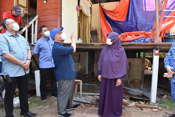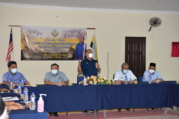 “Kami tiba pada hari ini untuk meninjau kawasan-kawasan yang terkesan akibat bencana ribut yang telah berlaku pada 22 September 2021 (Rabu) yang lalu. Kita menerima laporan daripada Pegawai Daerah Manjung, Tuan Shamsul Ridzuan Bin Idris, bahawa terdapat 88 buah rumah yang telah terkesan dengan musibah ini. Banyak rumah penduduk yang rosak sama ada atapnya diterbangkan angin atau musnah dihempap pokok tumbang.