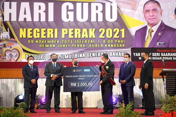 KUALA KANGSAR, 9 November 2021- YAB Menteri Besar Perak, Dato’ Saarani bin Mohamad telah menyempurnakan Majlis Sambutan Hari Guru Peringkat Negeri Perak Tahun 2021 yang dianjurkan oleh Jabatan Pendidikan Negeri Perak di Dewan Jubli Perak, di sini, hari ini.