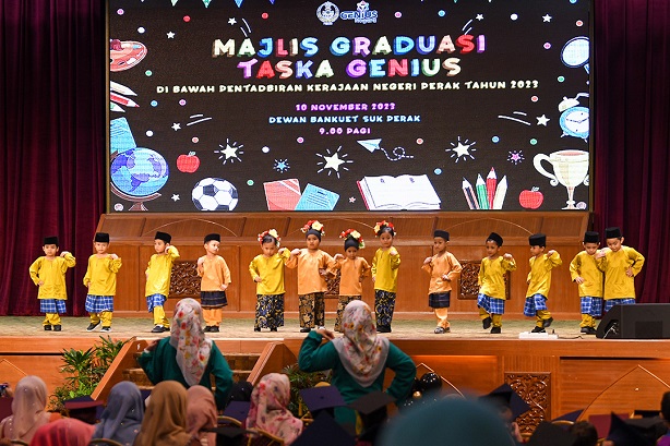Dalam perkembangan sama, majlis graduasi tersebut turut diserikan lagi dengan persembahan oleh pelajar-pelajar empat tahun dari 10 buah Taska Genius di bawah PSUK Perak.
