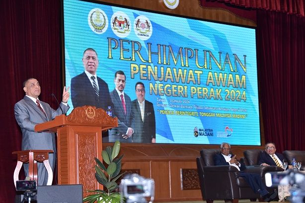 IPOH, 3 Januari 2024 - YAB Menteri Besar Perak, Dato’ Seri Saarani bin Mohamad telah merasmikan Seminar dan Perhimpunan Penjawat Awam Negeri Perak yang dianjurkan oleh Kongres Kesatuan Pekerja-pekerja di Dalam Perkhidmatan Awam (CUEPACS) di Dewan Bankuet, Bangunan Perak Darul Ridzuan.