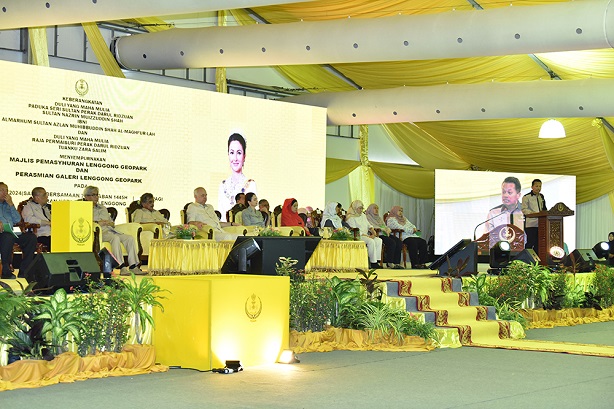 LENGGONG, 9 Mac 2024 - DYMM Paduka Seri Sultan Perak Darul Ridzuan, Sultan Nazrin Muizzuddin Shah Ibni Almarhum Sultan Azlan Muhibbuddin Shah Al-Maghfur-Lah dan DYMM Raja Permaisuri Perak Darul Ridzuan, Tuanku Zara Salim berkenan bercemar duli berangkat ke Majlis Pemasyhuran Lenggong Geopark dan merasmikan Galeri Lenggong Geopark di Dataran Kota Tampan, di sini.