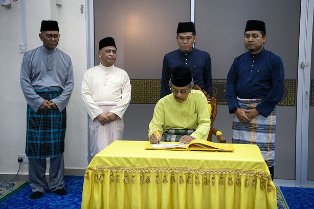 DYTM Raja Muda Perak Darul Ridzuan ketika menandatangani buku pelawat Masjid Ar-Raudhah
