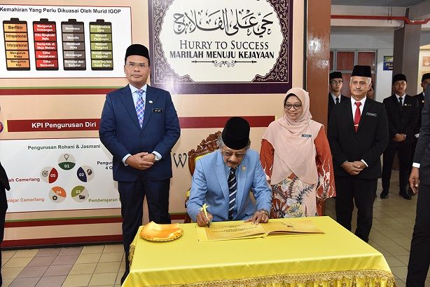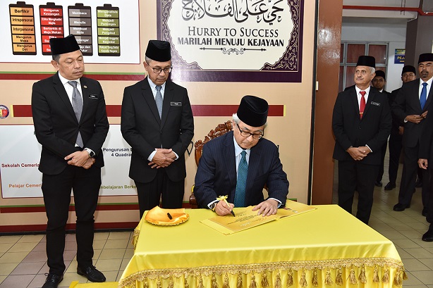 DYMM Paduka Seri Sultan Perak Darul Ridzuan ketika menandatangani plak perasmian SBPI Gopeng.