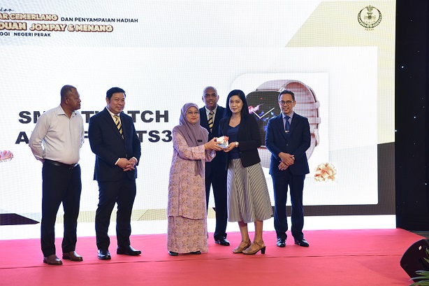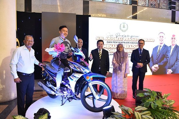 YB Pengerusi Jawatankuasa Pendidikan, Pengajian Tinggi, Belia dan Sukan Negeri ketika menyampaikan hadiah utama Peraduan JomPay dan Menang.