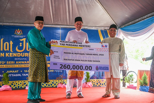 Setelah itu, YAB Dato' Seri Anwar bin Ibrahim diiringi YAB Dato’ Seri Saarani bin Mohamad; YB Senator Dato' Seri Diraja Dr. Zambry bin Abdul Kadir; YB Dato' Mohammad Zahir bin Dato’ Abdul Khalid dan YB Dato’ Ahmad Suaidi bin Abdul Rahim meluangkan masa untuk menunaikan solat Jumaat bersama jemaah ketika Majlis Kenduri Rakyat di Masjid Al-Muttaqin, Taman Meru, di sini.